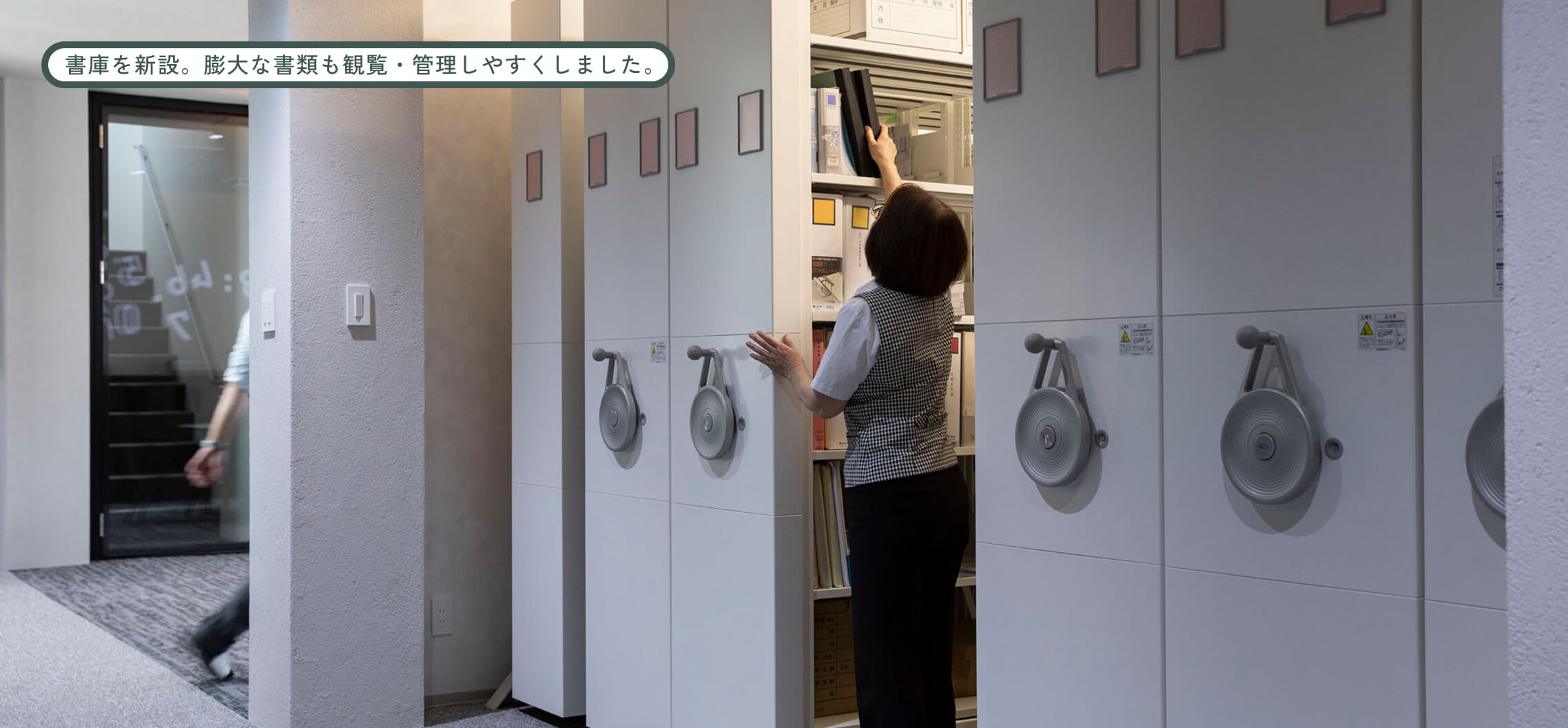 新耐震基準対応のため基礎と躯体のみを残す大規模な改築となったぶん、旧社屋のフォルムや柱の位置などをできるだけ生かした設計に。大切に歴史を継承しながらも、同時に未来に向けた投資としてオフィスインテリアには上質な海外ブランドなどを多数セレクト。ベテラン社員も、若手社員も、日々働く誇りを感じられるような空間づくりを目指しました。